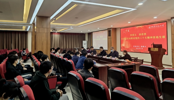 徐雁冰从深悟大会的主题、深悟过去五年的工作和新时代十年伟大变革、深悟开辟马克思主义中国化时代化的新境界、深悟新时代新征程中国共产党的使命任务、深悟教育科技人才重大支撑、深悟团结奋斗与青年强则国家强等六个方面,对党的二十大报告作了深入浅出的分析与解读,并结合学校、学院实际,就如何学习贯彻二十大报告精神提出了具体的要求,为在场师生上了一场精彩的思政课。