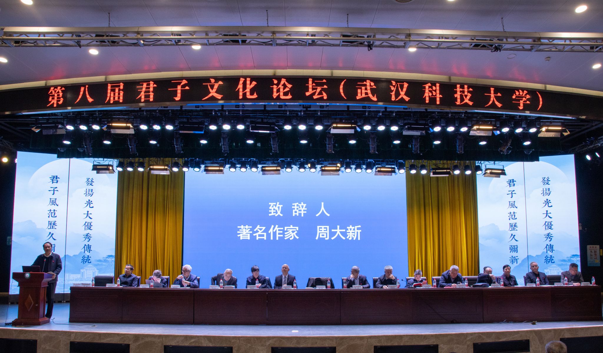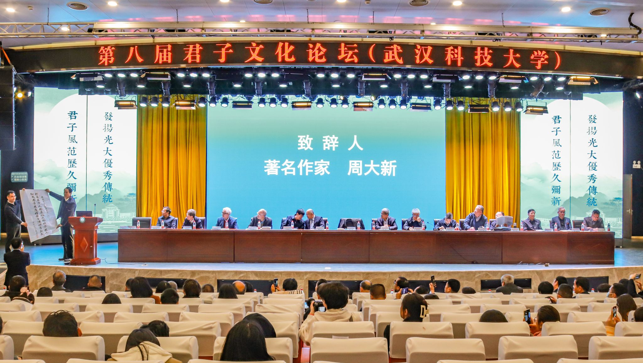 君子风范历久弥新,发扬光大优秀传统。11月11日,第八届君子文化论坛开幕式在我校青山校区钢铁楼碧园会堂召开,本次论坛讨论的主题为“君子文化的知与行”。来自全国高校、科研院所、君子文化研究机构的专家学者和我校师生300余人齐聚一堂,共话君子文化传承与创新。校长倪红卫,光明日报社原副总编辑李春林,著名作家周大新,中央党校教授、中国实学研究会会长王杰出席开幕式并致辞。校党委常委胡剑主持开幕式。