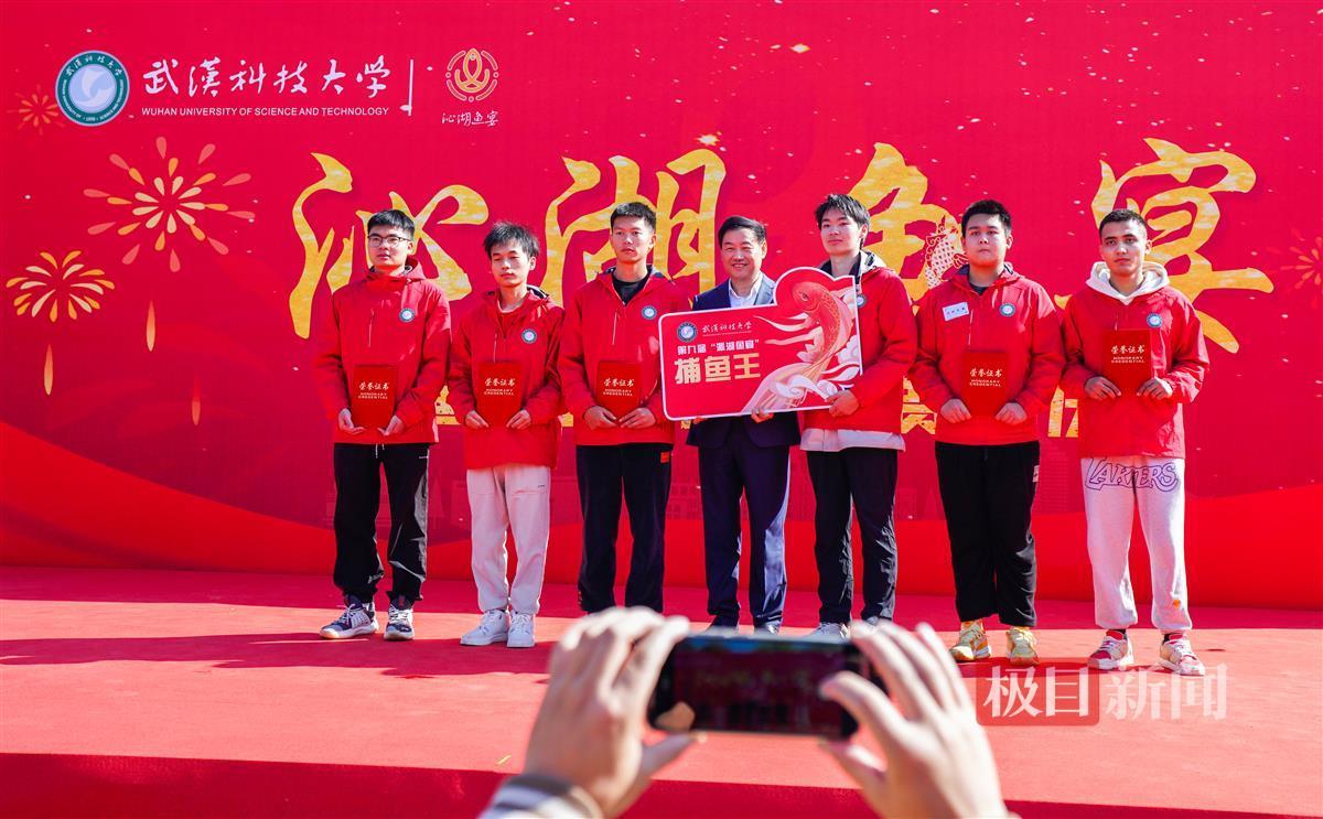 “大家加把劲,争取多捞一点,让每一位武科大人都吃上自家湖里的鱼!”上午8时许,随着一声“收网”,该校近百名师生开始在沁湖边拉纤,合力拉渔网,将其收拢至岸边。九时收网,一条条大鱼活蹦乱跳,16名身穿捕鱼套装的学生随即下水捕鱼。经过半小时的比拼,资源与环境工程学院学生张鑫捕了一条30.2斤重的大鱼,获得了今年的“捕鱼王”称号。他举着大鱼激动地说:“今年我要为学校125周年校庆献上这条最重的大鱼!”