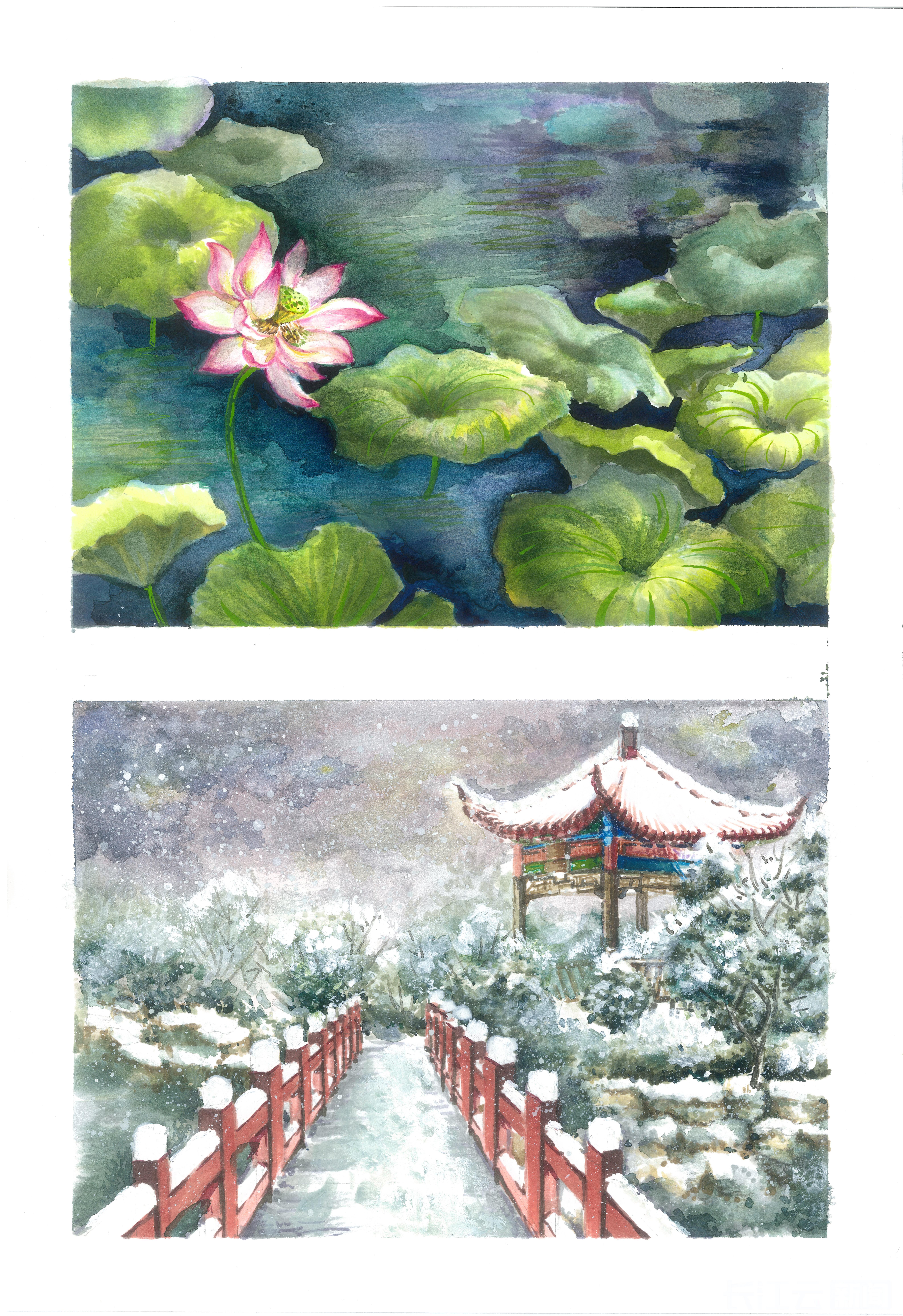 作品《谢师亭与沁湖》以谢师亭与湖心岛为核心,用荷叶、湖水、廊桥等校园风景元素加以点缀,构成了一副独具武科大特色的水墨风景画。“在水墨画中,平时司空见惯的谢师亭居然另有一番美意!”作者刘玥含说道,“中国画的形式能够很好地呈现武科大的文化底蕴,也给了我们一次静下心来观察校园的机会。”