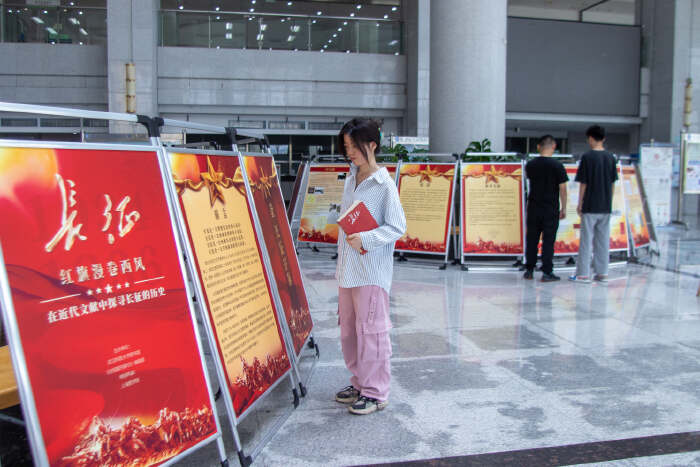 为致敬长征出发90周年,该校已于一周前在图书馆设置了“探寻长征”文献展,用四十多块展板回顾红军长征时的关键历程,辅以陈列相应的书籍。该校学生唐思彤正在学习《中国近现代史纲要》课程,此次她特意前来观看学习,看完后的她不禁感叹:“先辈们的长征路充满艰辛,我们要更珍惜来之不易的今天!”