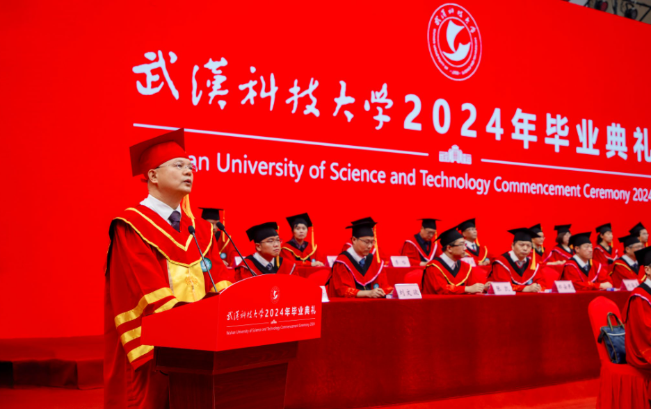 副校长吕勇宣读关于授予陈哲等919名学生2024届“优秀毕业生”和周佳丽等10名学生2024年“校长奖章”的决定。全体校领导为优秀毕业生代表授学位、为校长奖章获得者颁奖、为校友联络员代表颁发聘书。理学院博士毕业生杨金荣作为优秀毕业生代表上台,校长倪红卫为她颁发学位证书、拨穗。她说:“好激动!好荣幸!感谢武科大的领导、老师、同学和朋友一路以来的支持与关心。”