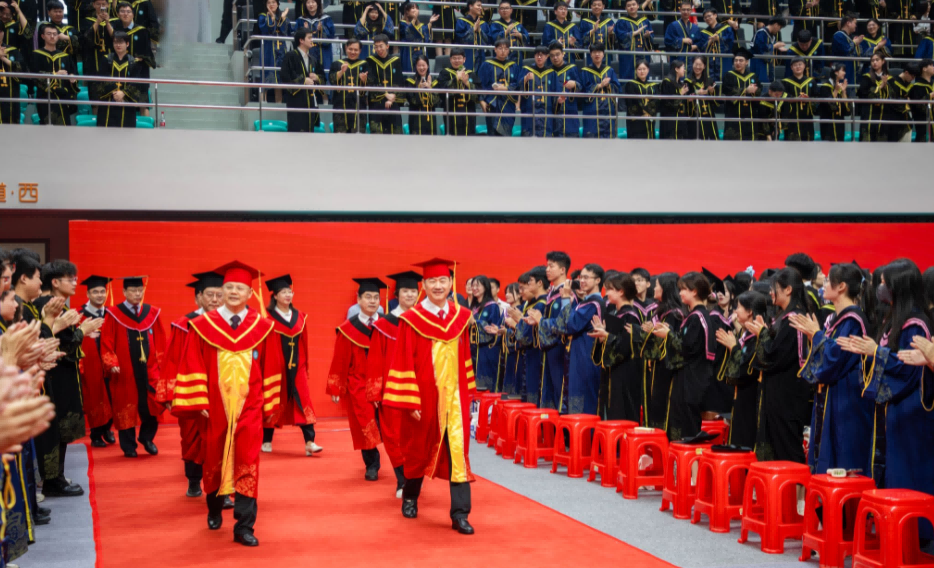 “同学们,就要和你们告别了!”在现场播放的《毕业寄语》视频里,徐雁冰谆谆教导:“学校会把毕业生的登记照、成绩单和‘一串串脚印’永久留存,也希望毕业生们奔赴山南海北时带着‘上课’的状态、‘乐跑’的习惯和‘熄灯’的约束。”各学院(部)主要领导也纷纷为毕业生送上祝福,最终凝聚成一句“常回母校看看”。现场掌声不断、欢呼声不停。