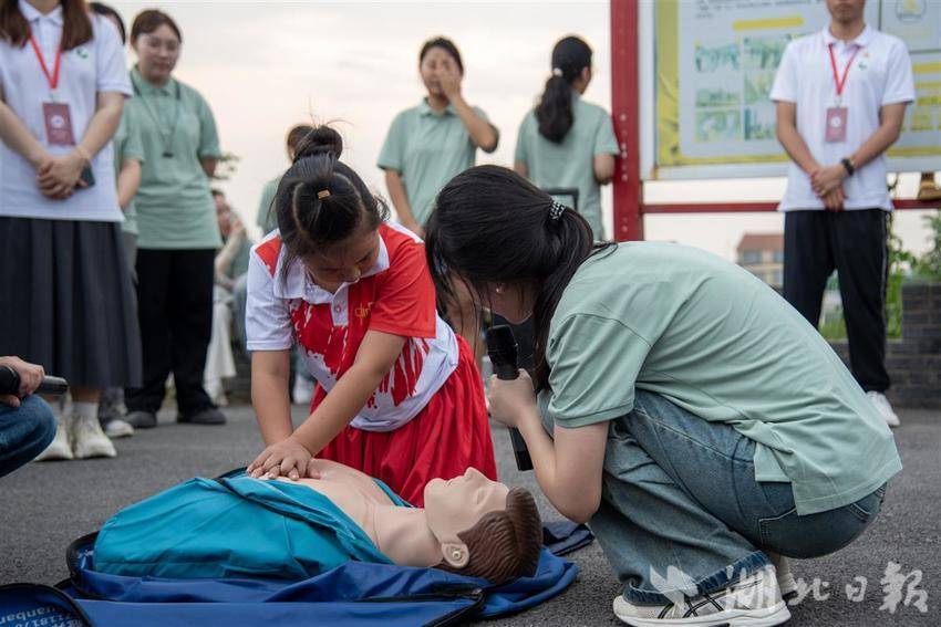此外,实践团成员们还现场示范了心肺复苏术的具体流程,在成员们的协助下,小朋友雷嘉颖完整且准确地完成了心肺复苏术的操作,雷嘉颖妈妈笑着说:“谢谢你们这么耐心地教我们,我们一定牢记防溺水知识。”