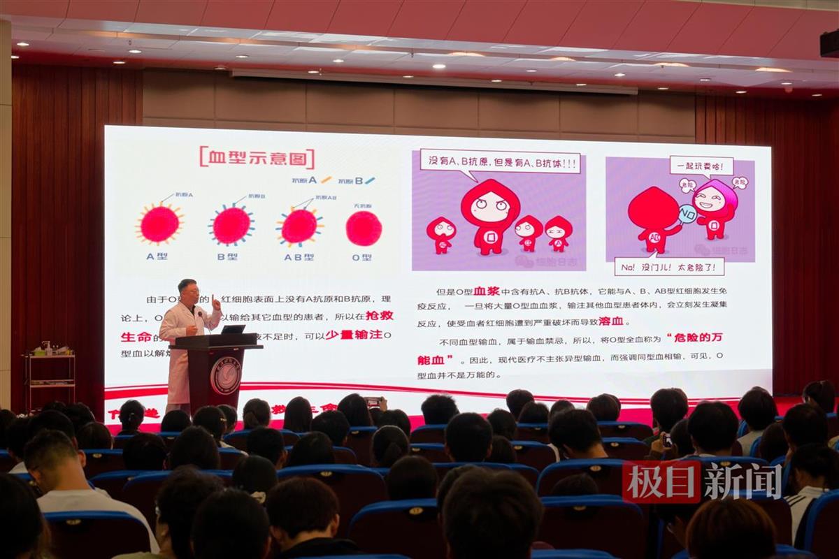 随着一段关于无偿献血街头随机采访的播出,情景剧《血型宝贝》闪亮登场,“A”“B”“O”“AB”四种血型“变身”血型宝宝,逐一揭开了血型背后的秘密。《让我留在你身边》则聚焦一对年轻夫妻,生动再现了普通人从不理解无偿献血到被无偿献血者感动的心态转变。演讲《一张永不褪色的献血证》以献血200余次的“兵哥哥”宗晓斌为原型,娓娓道出了他从一名普通士兵到“热血先锋”的故事。武汉血液中心无偿献血科普达人王丹则巧妙地将关于输血、血液的一个个科普知识点穿插演绎,同时也普及了“无偿献血者优先用血” “四免优待政策”等无偿献血政策,客观准确地解答了大家对于献血的常见疑惑。活动快要结束时,同学们收到了意外的惊喜:原来每位同学的座位下都“藏着”一个“热血信物”——特别定制的“热血新青年”徽章,武汉血液中心期待同学们戴上“热血信物”献一次血,将爱心不断传递。
