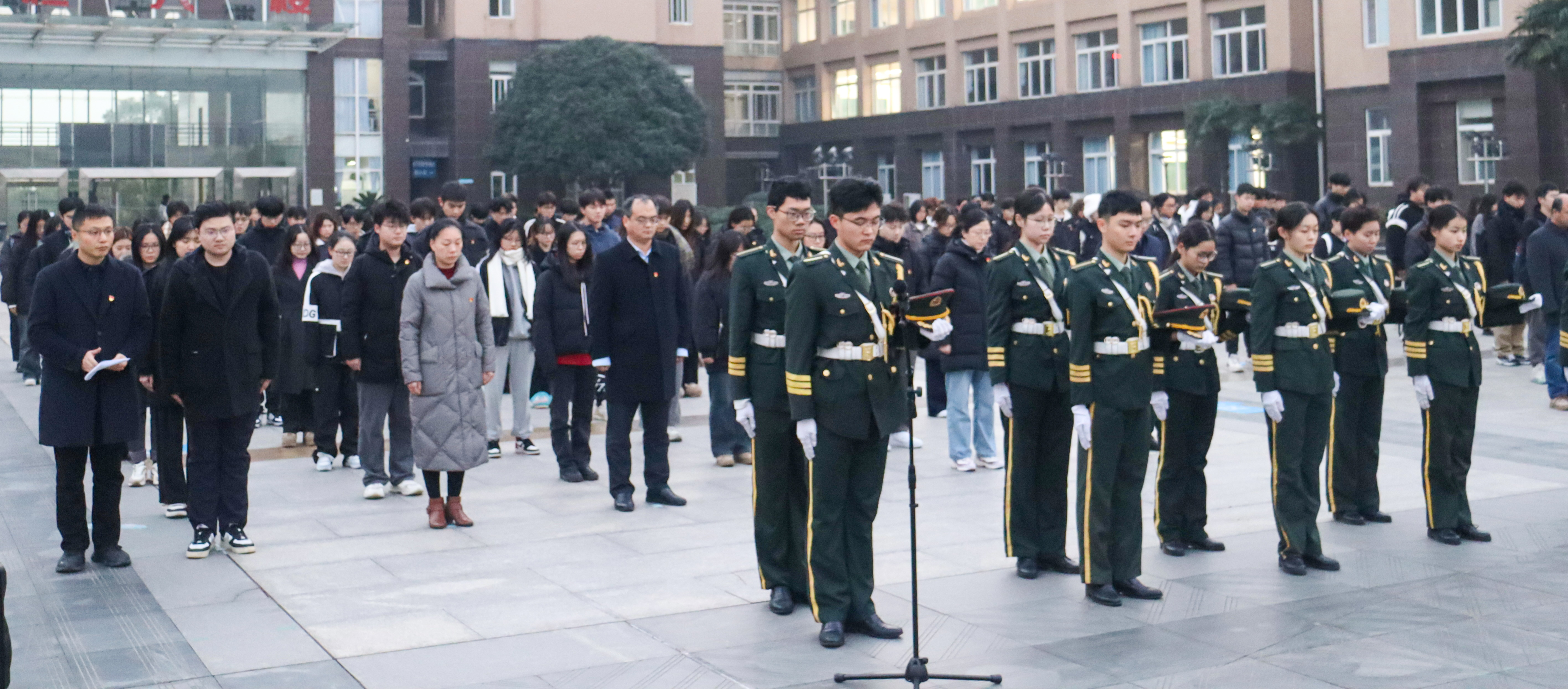 上午7时,伴随庄严的国歌声,鲜艳的五星红旗冉冉升起,师生共同行注目礼,高唱国歌。随后,国旗护卫队将五星红旗缓缓降至旗杆半高,全体师生默哀三分钟,表达对南京大屠杀死难者的深切哀悼,共同缅怀为争取民族独立和人民解放而英勇献身的革命先烈。