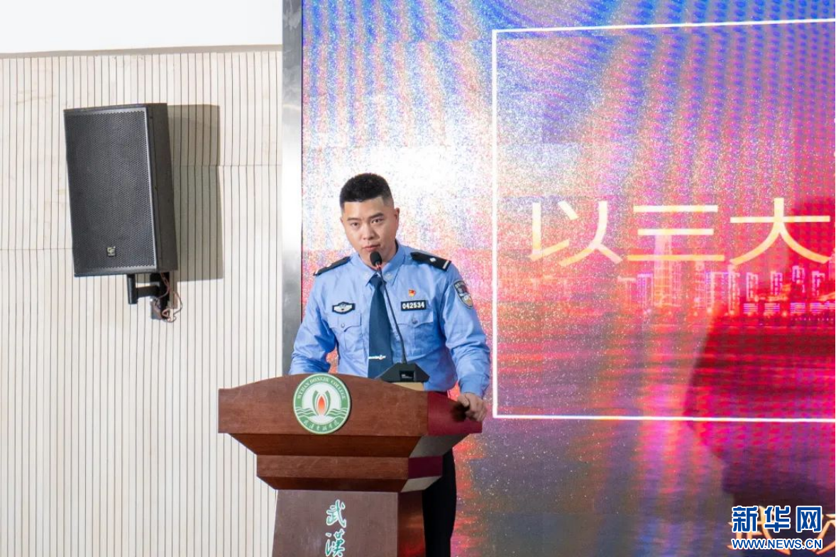 武汉市公安局反恐怖和特警支队特警李一沐一身藏蓝警服,让同学们肃然起敬。他讲述了青年民警的工作日常,从守护红色热土的坚定足迹,到抗击洪水时筑起的人墙,再到疫情肆虐时无畏的逆行,人民警察的身影始终在最需要的地方挺立。